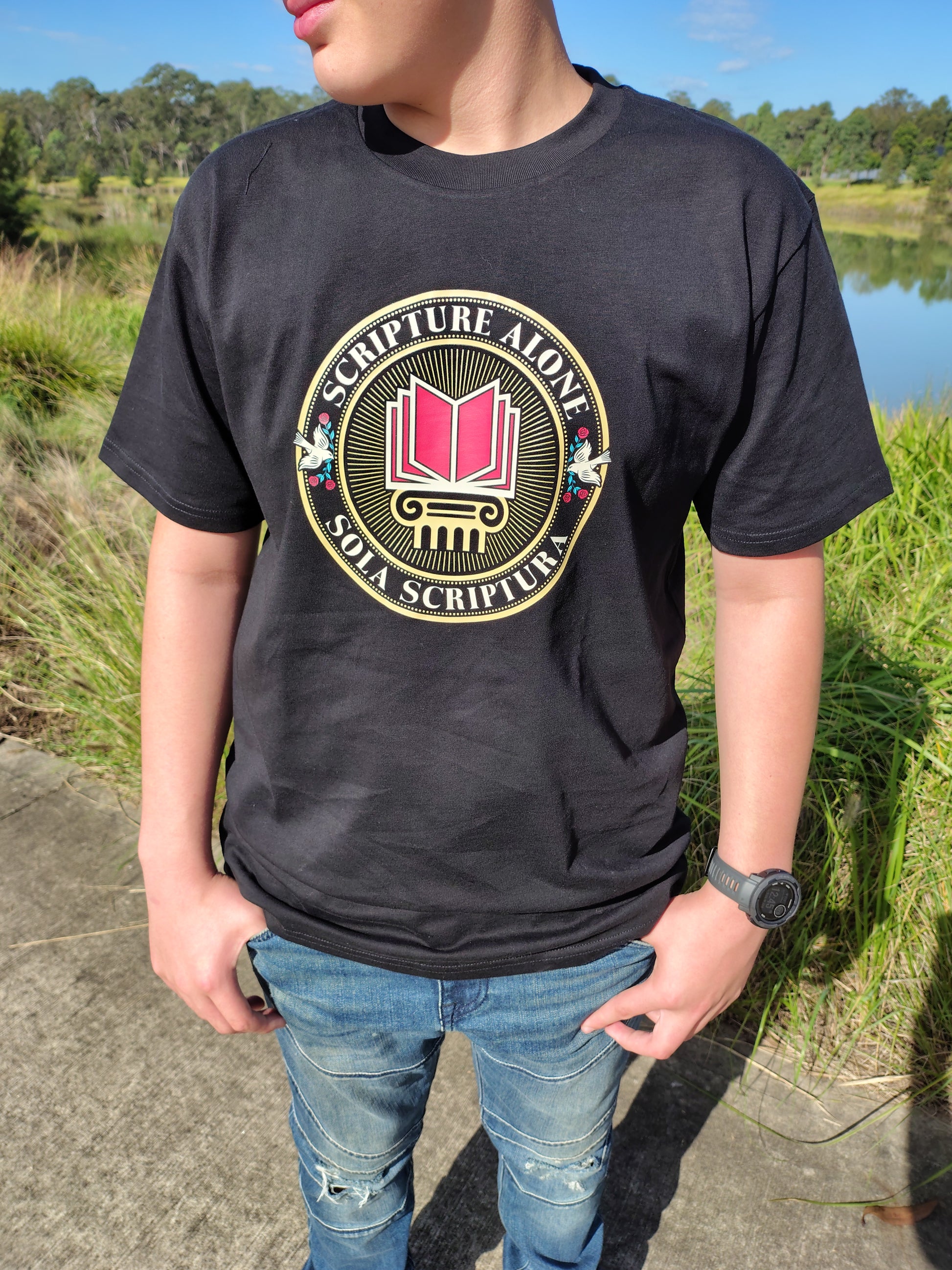 This design centers around one of the foundational truths of the Reformation: that God’s Word is our ultimate authority in all of life and doctrine. The emblem-style artwork gives it a classic, bold feel — a visual reminder that we don’t stand on tradition, emotion, or culture, but on the unchanging truth of Scripture.